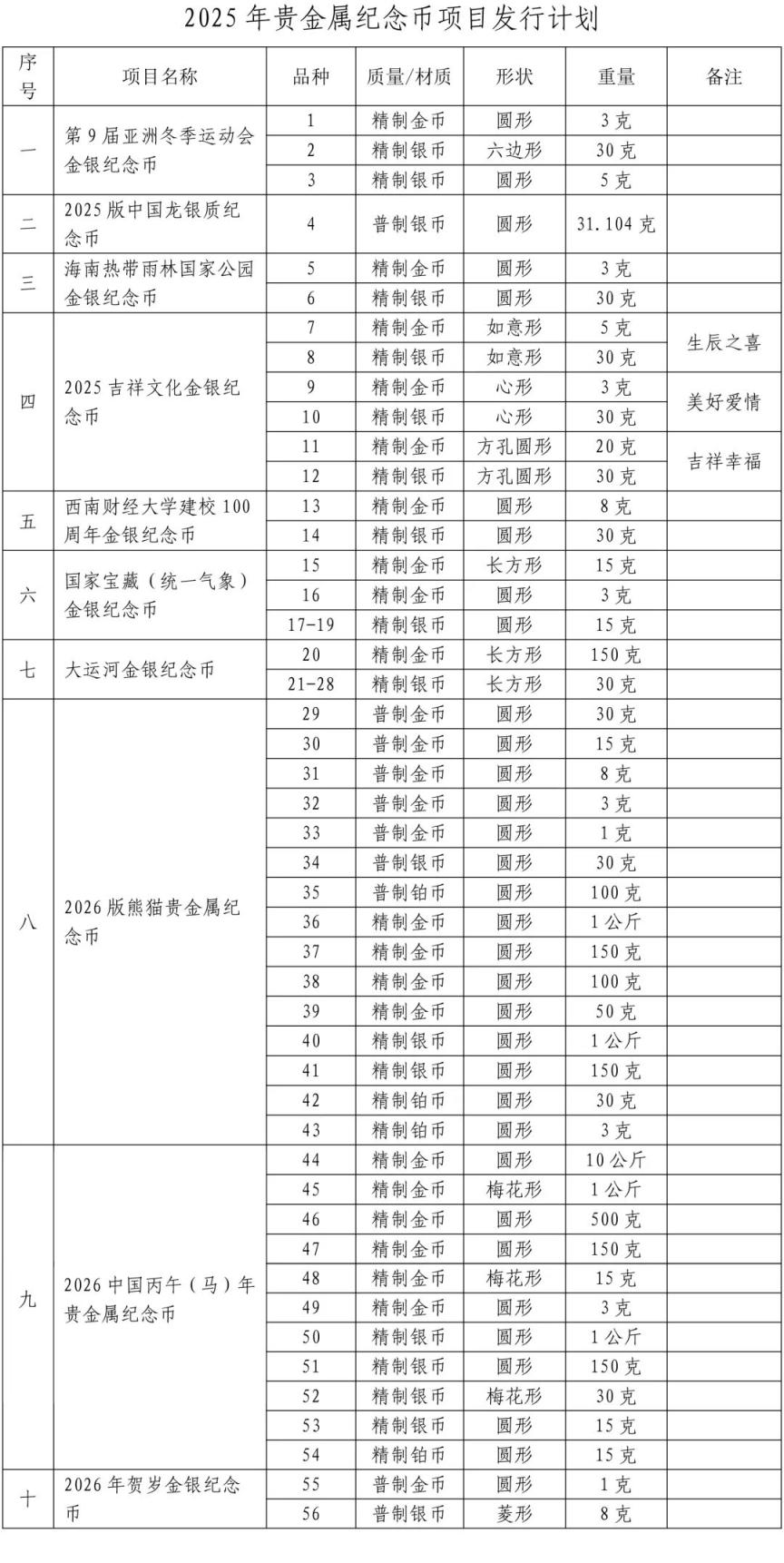 10个技俩包括:第9届亚洲冬季通顺会金银缅思币、2025版中国龙银质缅思币、海南热带雨林国度公园金银缅思币、2025吉利文化金银缅思币、西南财经大学建校100周年金银缅思币、国度矿藏(搭伙格局)金银缅思币、大运河金银缅思币、2026版熊猫贵金属缅思币、2026中国丙午(马)年贵金属缅思币、2026年贺岁金银缅思币。