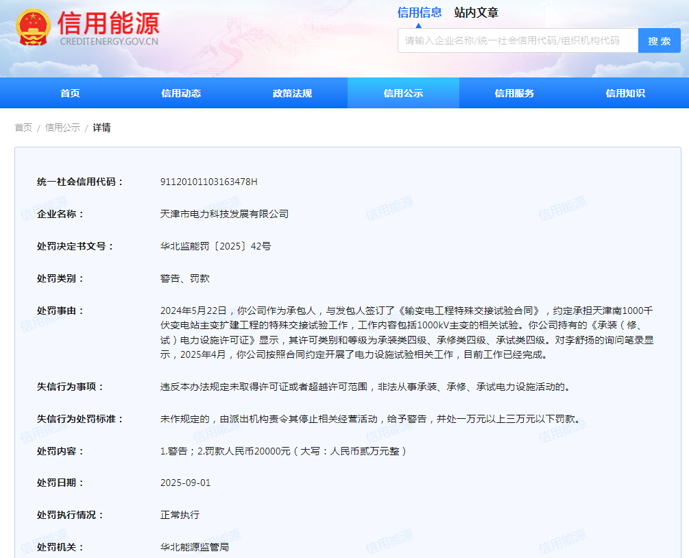 失信行动事项为该公司违犯本办律例定未得回许可证不祥卓绝许可限制,犯法从事承装、承修、承试电力体式行为的。华北动力监管局对其作出警告并罚金东说念主民币20000元。