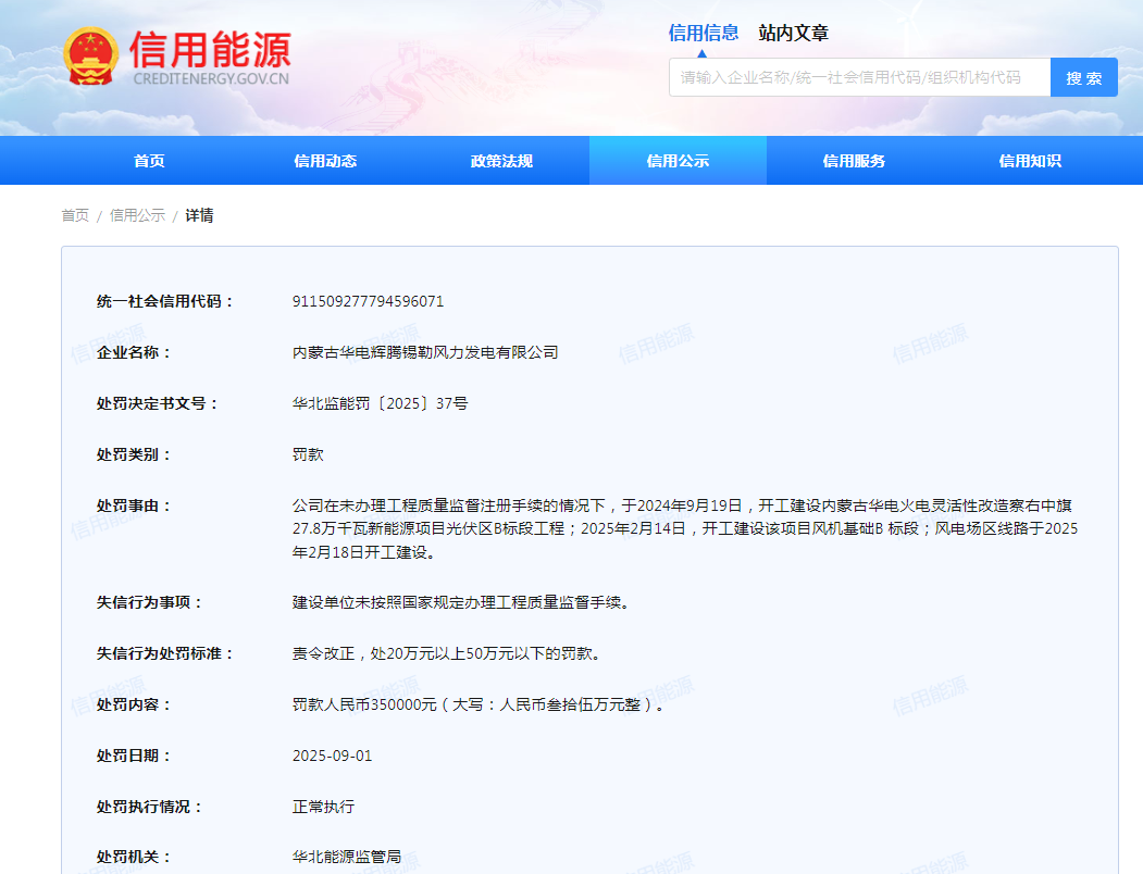 近日,信用动力公示了内蒙古华电辉腾锡勒风力发电有限公司的行政措置决定。措置决定书文号华北监能罚〔2025〕37号走漏,内蒙古华电辉腾锡勒风力发电有限公司在未办理工程质料监督注册手续的情况下,于2024年9月19日,开工斥地内蒙古华电火电活泼性立异察右中旗27.8万千瓦新动力项眼神伏区B标段工程;2025年2月14日,开工斥地该表情风机基础B 标段;风电场区澄莹于2025年2月18日开工斥地。