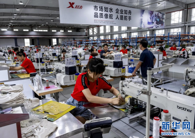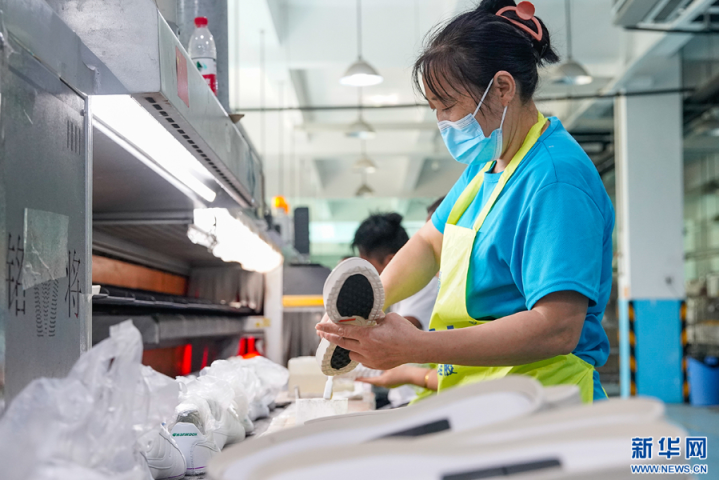 在特步集团的智能贯通鞋分娩线上,工东说念主们在赶制出口订单。新华社记者 魏培全 摄